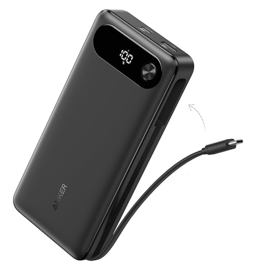 Choose a high-capacity portable charger, like Anker Laptop Power Bank,  that can recharge your phone and electronics throughout your entire flight.